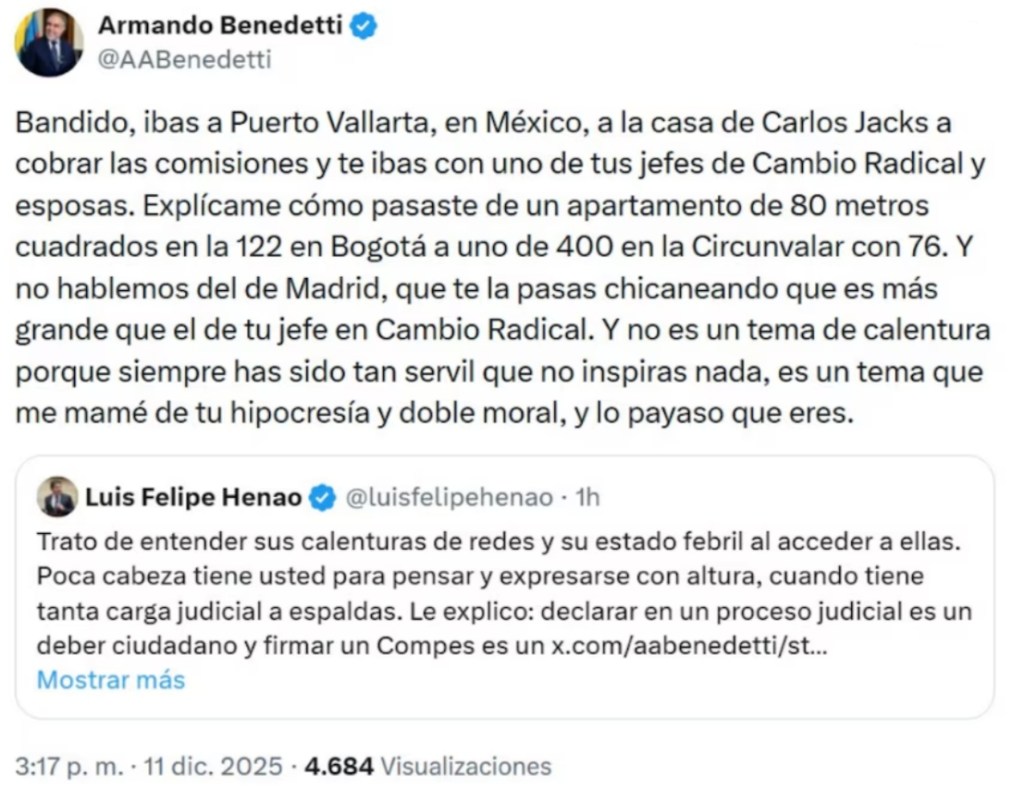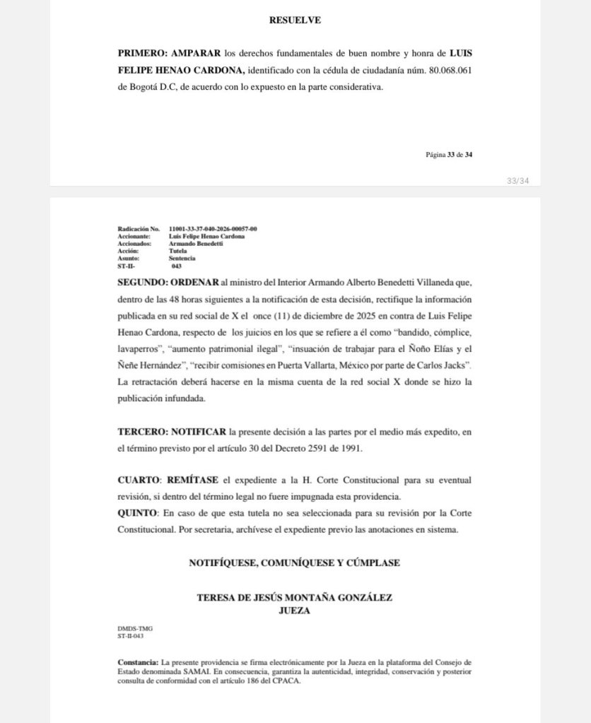 El trasfondo adquiere mayor relevancia si se considera que Benedetti enfrenta un proceso en la Corte Suprema de Justicia por presunto tráfico de influencias en el caso Fonade. Ese contexto ha intensificado su confrontación con sectores judiciales y políticos, y ha elevado el tono de sus intervenciones. La tutela ahora resuelta muestra que ese estilo tiene consecuencias jurídicas cuando las afirmaciones afectan derechos fundamentales sin respaldo probatorio suficiente.