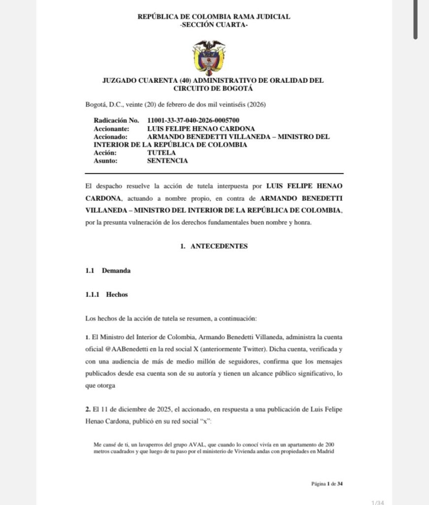 Bogotá, 23 de febrero de 2026 –La decisión judicial introduce un límite concreto al discurso de uno de los funcionarios más visibles del Gobierno. El fallo no cuestiona el derecho del ministro a ejercer control político ni a formular críticas, pero sí delimita cuándo esas intervenciones cruzan la línea y se transforman en afirmaciones que presentan como hechos probados conductas delictivas sin soporte verificable. En ese punto, concluye el juez, se activa la protección constitucional del buen nombre y la honra.