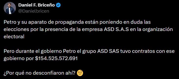 El concejal de Bogotá Daniel F. Briceño cuestiona que sectores del petrismo pongan en duda la transparencia de las elecciones de 2026 por la participación del Grupo ASD S.A.S., mientras el propio gobierno de Gustavo Petro le ha adjudicado contratos por 154.525.572.691 pesos entre 2022 y 2026. En un mensaje en redes, el cabildante adjunta una tabla con doce contratos suscritos con entidades como el ICFES, los ministerios de Trabajo y Vivienda y el Fondo Único de TIC. El cruce se da tras un reportaje de Revista RAYA que alertó sobre antecedentes de la empresa en Honduras y su rol en la infraestructura electoral colombiana.