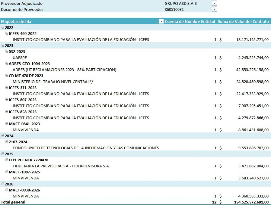 Al mismo tiempo, la contratación de servicios de tecnologías de la información con empresas especializadas no se limita al ámbito electoral. Entidades como el ICFES, ministerios sectoriales y fondos adscritos han recurrido de manera recurrente a firmas con experiencia en manejo masivo de datos, desarrollo de software y soporte logístico. La tabla difundida por Briceño refleja esa práctica extendida y muestra que, durante la administración de Gustavo Petro, ASD ha mantenido una posición relevante como proveedor estatal.