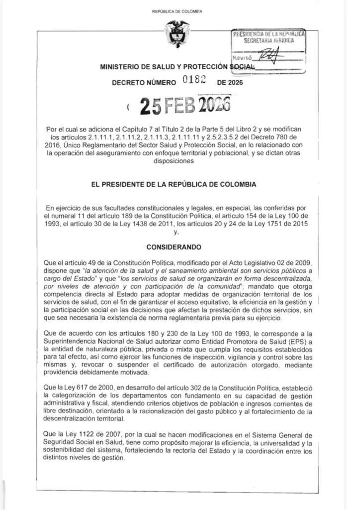 El Ministerio de Salud expidió el Decreto 0182 del 25 de febrero de 2026, que modifica el régimen de aseguramiento y fija límites a cuántas EPS pueden operar en cada departamento y municipio según su población y participación de afiliados. La norma establece umbrales mínimos para permanecer en un territorio y ordena que, si una entidad no los cumple, sus usuarios sean reasignados en máximo cinco días hábiles por el Ministerio y la ADRES a otras EPS habilitadas. Análisis sectoriales estiman que millones de personas podrían ser trasladadas, con más de 2,6 millones concentrándose en Nueva EPS.