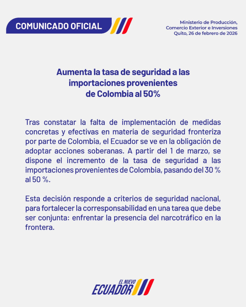 El gobierno de Ecuador anunció que desde el 1 de marzo de 2026 elevará del 30% al 50% la “tasa de seguridad” aplicada a todas las importaciones provenientes de Colombia. La decisión fue comunicada el 26 de febrero por el Ministerio de Producción, Comercio Exterior e Inversiones, que argumenta falta de acciones suficientes de Bogotá en la seguridad fronteriza. Anteriormente, Gustavo Petro ya había respondido al primer recargo con aranceles espejo del 30% y restricciones terrestres. La medida profundiza la disputa comercial en un contexto de creciente violencia ligada al narcotráfico en la frontera norte.
