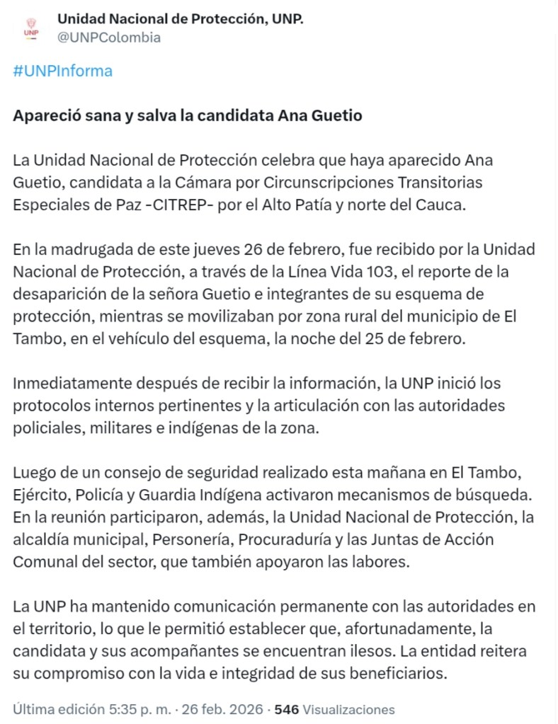 Ana Libia Guetio, integrante del pueblo nasa y candidata a las Circunscripciones Transitorias Especiales de Paz en el Cauca, pierde contacto la noche del 25 de febrero cuando se desplazaba desde el corregimiento de Pandiguando, en El Tambo, hacia el municipio de Morales tras una actividad proselitista. Su equipo reporta que hacia las 8.40 p. m. deja de responder llamadas. Horas después se activa la guardia indígena y se alertan rutas institucionales de búsqueda en un departamento con presencia de disidencias, estructuras posparamilitares y economías asociadas al narcotráfico.
