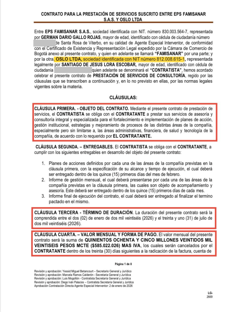 La EPS Famisanar, intervenida por la Superintendencia Nacional de Salud, adjudica un contrato por 4.095 millones de pesos a la empresa Oslo Ltda., con sede en Montería, pese a no tener afiliados en Córdoba. El acuerdo, firmado por el agente interventor Germán Darío Gallo Rojas, busca prestar asesoría para fortalecer procesos administrativos y tecnológicos. El representante Andrés Forero cuestiona la idoneidad de la firma, que reporta un capital de 5 millones y actividades principales ajenas a la consultoría en salud. La polémica surge mientras usuarios denuncian demoras en atención y la entidad continúa bajo prórroga de intervención estatal.