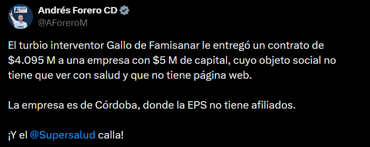 La denuncia tomó fuerza en redes sociales luego de que Forero publicara copias del contrato y del certificado de Cámara de Comercio de Montería. El congresista calificó de “turbio” al interventor y sostuvo que el acuerdo sería una muestra de uso ineficiente de los recursos de la EPS. El contraste entre el tamaño financiero de la contratista y el valor del negocio, así como la ausencia de afiliados de Famisanar en Córdoba, alimentó cuestionamientos sobre la lógica técnica y territorial de la decisión.