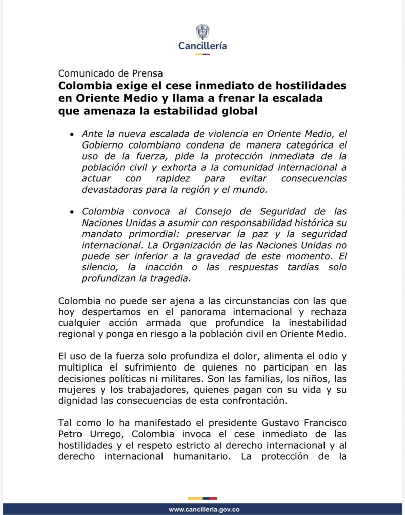 El pronunciamiento se produce en paralelo a la convocatoria de una sesión de emergencia del Consejo de Seguridad de la ONU, donde se analiza la escalada entre Washington, Tel Aviv y Teherán. El secretario general António Guterres pidió un cese inmediato de las hostilidades y advirtió sobre el riesgo de una ampliación regional del conflicto. Colombia se suma así al grupo de países que priorizan la desescalada y el respeto al derecho internacional humanitario.