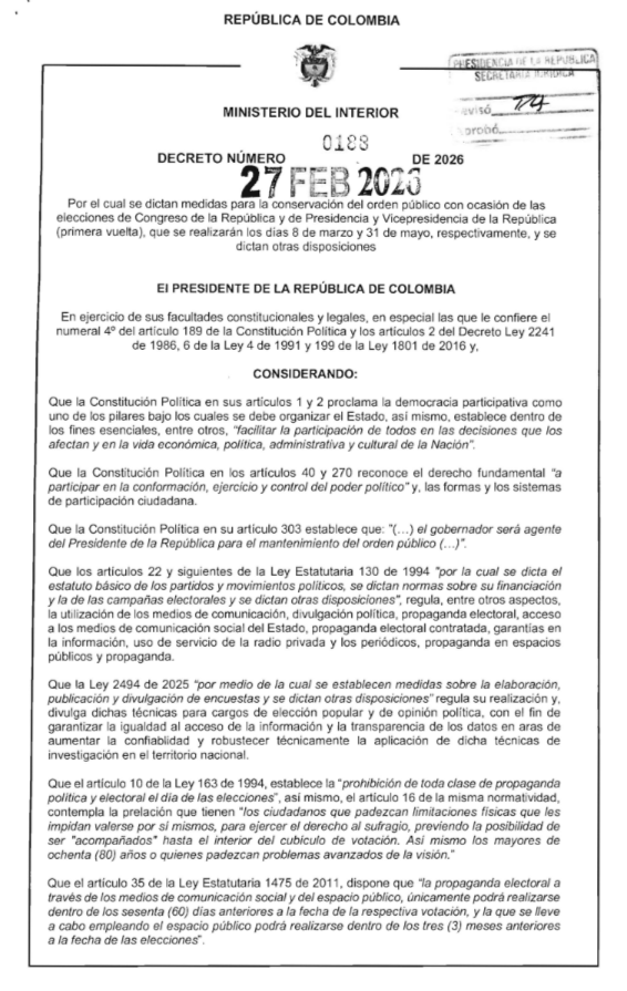 El Gobierno Nacional expide el Decreto 0188 del 27 de febrero de 2026 con medidas especiales de orden público para las elecciones legislativas del 8 de marzo y la primera vuelta presidencial del 31 de mayo en Colombia. La norma impone ley seca, cierre de fronteras terrestres y fluviales, restricciones a la propaganda política, límites a la movilidad y obligaciones para empresas de transporte, además de facultades extraordinarias para alcaldes y gobernadores. El objetivo es garantizar seguridad, transparencia y normal desarrollo de las jornadas electorales en un contexto de amenazas a candidatos, tensiones institucionales y denuncias de posible fraude.