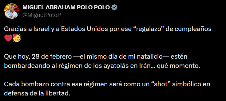 El representante a la Cámara Miguel Polo Polo calificó como “regalazo de cumpleaños” el bombardeo conjunto de Estados Unidos e Israel contra Irán, ocurrido el 28 de febrero, fecha de su natalicio. En un mensaje en X, agradeció a ambos gobiernos por atacar al “régimen de los ayatolás” y afirmó que cada bomba será para él como un “shot simbólico en defensa de la libertad”. El pronunciamiento contrasta con los llamados internacionales a la desescalada y con la posición oficial del Gobierno colombiano, que ha rechazado el uso unilateral de la fuerza.