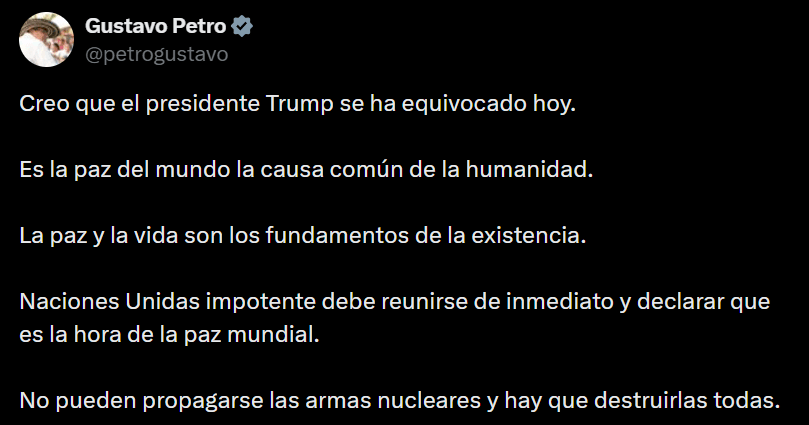 El mensaje se conecta con antecedentes recientes. En episodios previos de tensión entre Israel e Irán y en el conflicto en Gaza, Petro había pedido a Trump detener la guerra y suspender acciones militares contra Teherán. Su narrativa combina la defensa de civiles, en especial niños, con la crítica a la lógica de la disuasión armada como mecanismo de resolución de conflictos. Esa postura dialoga con su idea de Colombia como “potencia mundial de la vida” y con su apuesta por una diplomacia que privilegie foros multilaterales.