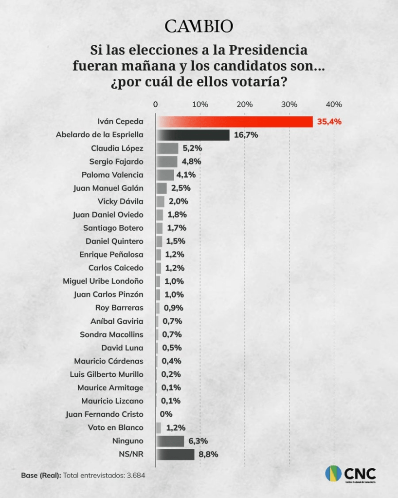 La encuesta de la revista Cambio y el Centro Nacional de Consultoría, realizada entre el 15 y el 21 de enero de 2026 a más de 2.200 personas en 56 municipios, ubica al senador Iván Cepeda como primero en intención de voto para las presidenciales de 2026 con cerca del 28% en primera vuelta. El sondeo también lo muestra liderando en escenarios de segunda vuelta frente a Abelardo de la Espriella, Sergio Fajardo y Paloma Valencia. Más del 23% de los consultados afirma que no votaría por ninguno o no responde. La Gran Consulta por Colombia registra la mayor intención de participación entre las consultas del 8 de marzo.