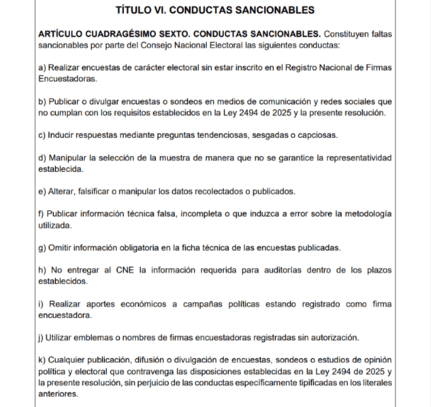 La norma establece que solo las firmas inscritas en el Registro Nacional de Firmas Encuestadoras pueden realizar estudios de carácter electoral. Además, obliga a que toda publicación incluya una ficha técnica completa con información verificable sobre tamaño y tipo de muestra, universo consultado, margen de error, método de recolección y fecha de trabajo de campo. Sin esos requisitos, la medición no puede presentarse como encuesta.