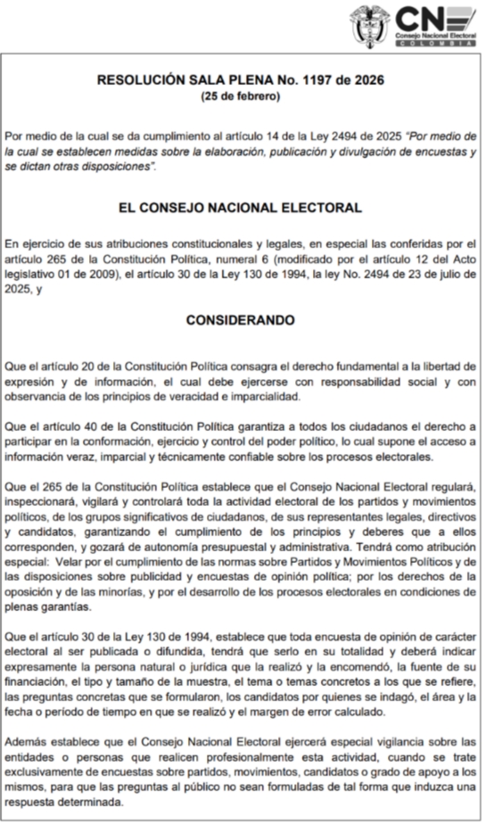 Bogotá, 2 de marzo de 2026 – La Sala Plena del Consejo Nacional Electoral aprobó el 25 de febrero la Resolución 1197 y la divulgó públicamente el 1 de marzo, una semana antes de las elecciones legislativas y consultas interpartidistas. La decisión llega en la recta final de la campaña presidencial de 2026 y redefine el marco bajo el cual se pueden producir y difundir encuestas de intención de voto en el país.