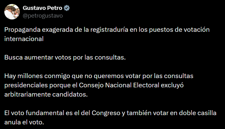Petro calificó el mensaje como “propaganda exagerada de la registraduría en los puestos de votación internacional” y sostuvo que “busca aumentar votos por las consultas”. En su mensaje agregó que “hay millones” de personas cercanas a su proyecto político que no quieren participar en esas consultas porque el Consejo Nacional Electoral excluyó a candidatos del progresismo, y subrayó que la prioridad debería ser la elección del Congreso.