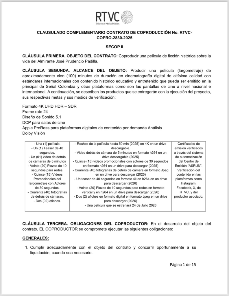 Bogotá, 5 de marzo de 2026 – Una producción cinematográfica financiada parcialmente con recursos públicos se convirtió en una nueva controversia política en Colombia. La película sobre el almirante José Prudencio Padilla fue financiada con un presupuesto total de 15.891.027.451 pesos, según documentos del contrato de coproducción suscrito entre RTVC y la empresa privada Valencia Producciones FX.
