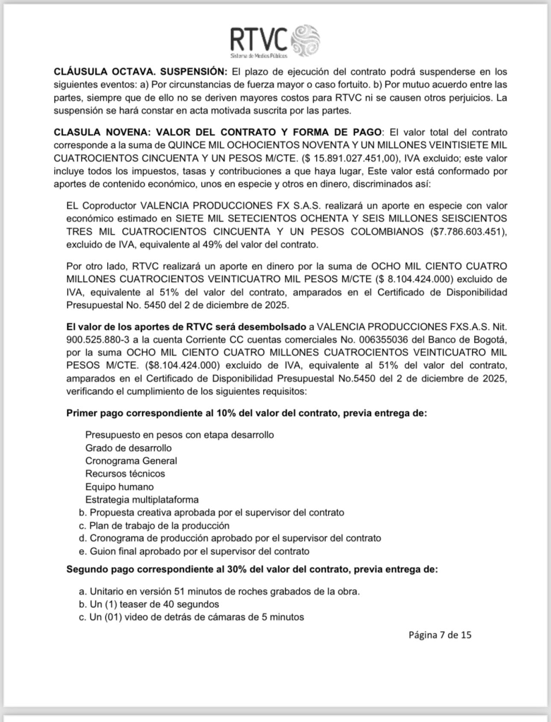 De ese total, al menos 8 mil millones de pesos provienen de recursos públicos aportados por RTVC y el Ministerio de Tecnologías de la Información y las Comunicaciones (MinTIC), mientras que la productora privada participa con 7.786 millones en especie. El acuerdo se firmó mediante contratación directa, sin convocatoria pública ni concurso abierto, un elemento que desencadenó cuestionamientos dentro del sector audiovisual y en la oposición política.