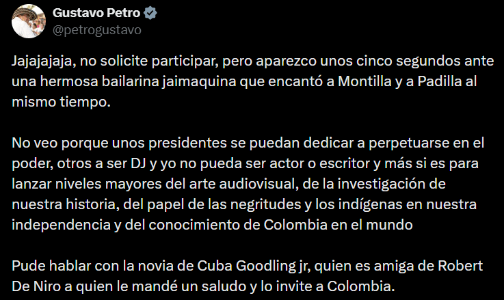 Petro confirmó su participación en redes sociales y señaló que su aparición dura apenas “unos cinco segundos”. También defendió su presencia en el proyecto como un ejercicio artístico personal, afirmando que tiene derecho a actuar o escribir, y comparó su incursión en el cine con actividades de otros mandatarios en el ejercicio del poder.