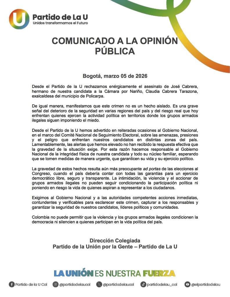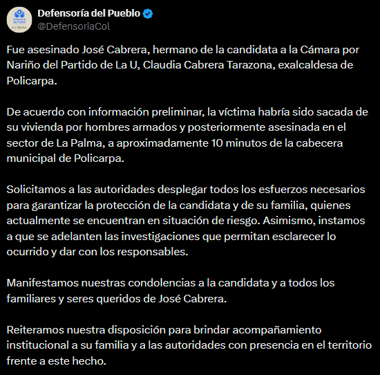 Héctor José Cabrera, hermano de Claudia Cabrera Tarazona, candidata a la Cámara por el Partido de la U, fue secuestrado y asesinado en Policarpa, Nariño, minutos después de ser sacado por hombres armados de su vivienda frente a sus hijos. Su cuerpo fue hallado en el sector rural de La Palma, a pocos minutos del casco urbano. Las primeras hipótesis de las autoridades señalan como posibles responsables a la columna Franco Benavides de las disidencias de las Farc, estructura vinculada al Estado Mayor Central comandado por alias Iván Mordisco. El crimen ocurre a pocos días de las elecciones del 8 de marzo y afecta directamente a la campaña de Claudia. Autoridades locales convocaron un consejo extraordinario de seguridad mientras avanzan las investigaciones.