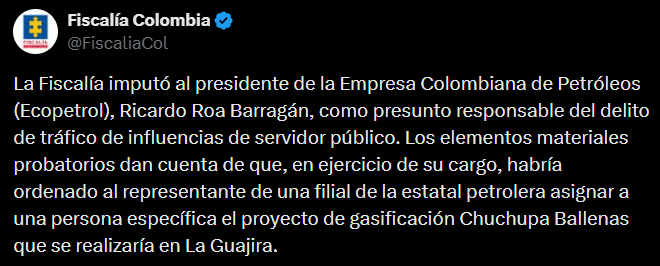 Roa asumió la presidencia de Ecopetrol en 2023. La junta directiva de la compañía lo ha respaldado públicamente frente a los procesos judiciales y ha señalado que se respetará la presunción de inocencia mientras avanzan las investigaciones. El desarrollo del proceso penal podría incidir en su continuidad al frente de la principal empresa estatal del país.