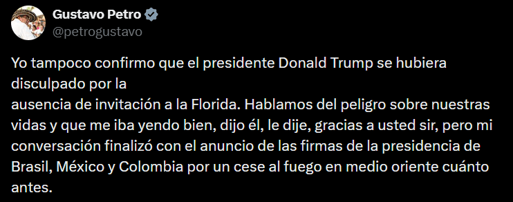 Aunque inicialmente la Presidencia colombiana informó que Trump había reconocido un «error» en el proceso de invitación a la cumbre antidrogas realizada en Miami, el mandatario colombiano aclaró que no hubo una disculpa formal. Según Petro, durante la conversación de 30 minutos, Trump mostró disposición para recomponer la relación bilateral, pero sin admitir culpas explícitas por la ausencia de Colombia en el evento regional.