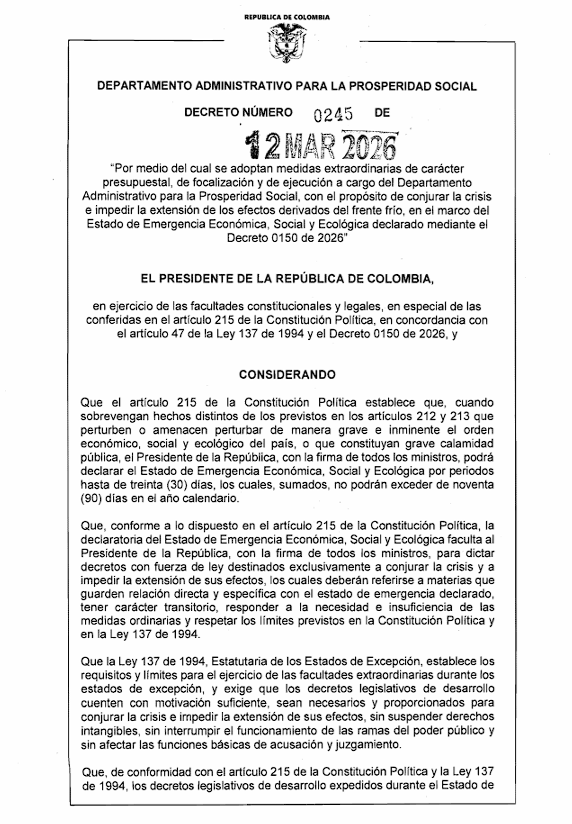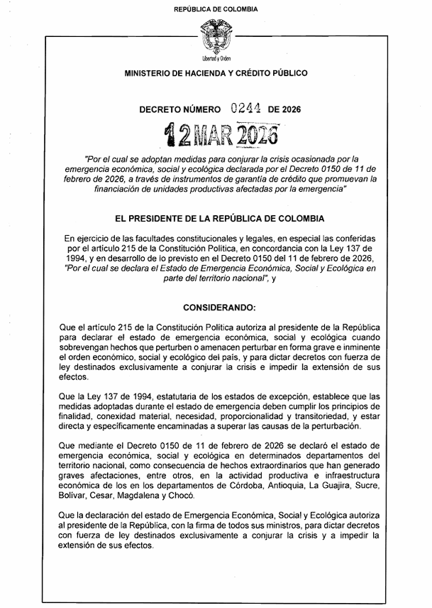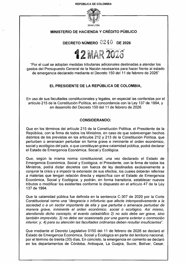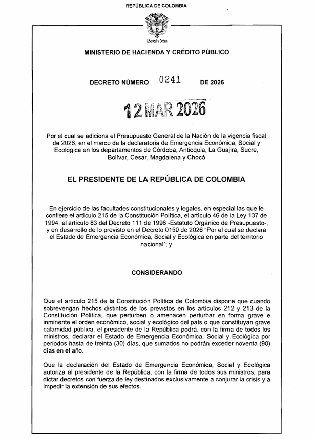 Bogotá, 12 de marzo de 2026 – El Gobierno del presidente Gustavo Petro ha expedido un paquete de siete decretos de emergencia económica con el fin de recaudar más de 8,6 billones de pesos. Las nuevas medidas tributarias, que afectan a las apuestas en línea, los grandes patrimonios y las normalizaciones fiscales, buscan financiar la atención a la crisis causada por la temporada de lluvias de 2026, que ha dejado graves daños en varios departamentos del país.