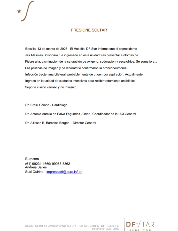 Brasilia, 14 de marzo de 2026 – El expresidente brasileño Jair Bolsonaro continúa internado en la Unidad de Cuidados Intensivos del hospital DF Star, en Brasilia, tras ser trasladado desde la cárcel de Papuda por un cuadro de bronconeumonía bacteriana bilateral. Un nuevo parte médico divulgado este sábado señala que el exmandatario permanece clínicamente estable.
