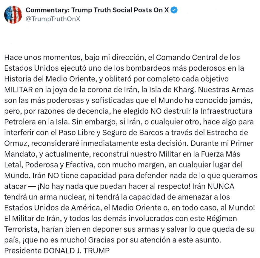 Trump afirmó en una publicación en redes sociales que las fuerzas estadounidenses ejecutaron “uno de los bombardeos más poderosos en la historia de Oriente Medio” contra objetivos militares en Kharg, a la que describió como la “joya de la corona” de la infraestructura militar iraní en esa zona. El mandatario sostuvo que los ataques destruyeron los blancos militares identificados y difundió imágenes que, según dijo, muestran las explosiones provocadas por los bombardeos.