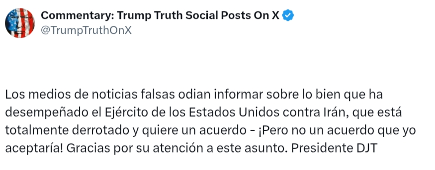 Trump también sostuvo que Teherán estaría buscando negociar. “Irán está totalmente derrotado y quiere un acuerdo, pero no uno que yo acepte”, escribió el mandatario, sin detallar las condiciones que considera inaceptables ni confirmar contactos diplomáticos en curso.