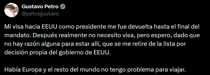 El propio Petro confirmó la decisión a través de su cuenta en X, donde señaló que la visa fue restituida hasta el final de su mandato y expresó que, una vez concluya su periodo, espera no requerir ese permiso. También indicó que no enfrenta restricciones para viajar a Europa u otras regiones.