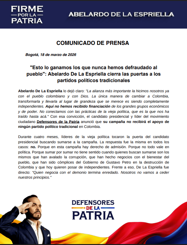 Bogotá, 18 de marzo de 2026 – Abelardo de la Espriella anunció que no aceptará el respaldo de partidos políticos tradicionales en su campaña presidencial hacia 2026 y convirtió esa decisión en el eje central de su estrategia electoral. El candidato aseguró que su proyecto se sostendrá únicamente con apoyo ciudadano y gremial, sin alianzas con estructuras que asocia con la “vieja política”.