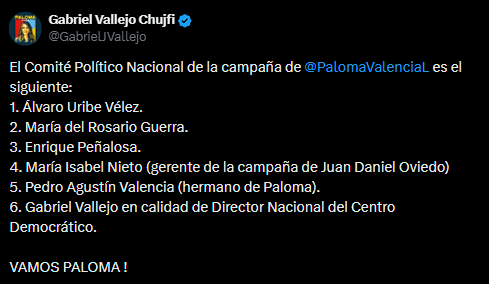 La conformación del equipo fue revelada por Gabriel Vallejo, director del partido, quien difundió los nombres a través de su cuenta en X en medio del proceso de reorganización de la campaña. La decisión llega días después de que Valencia se impusiera en la Gran Consulta por Colombia y en paralelo a la incorporación de Juan Daniel Oviedo como fórmula vicepresidencial.