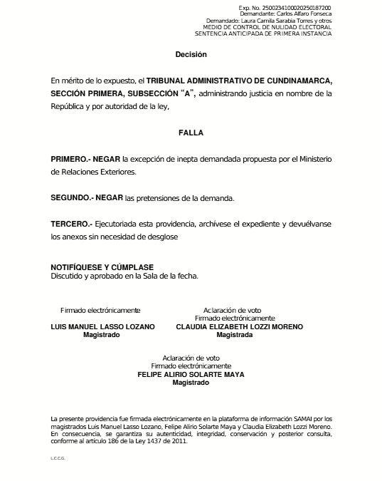Bogotá, 12 de marzo de 2026 – El Tribunal Administrativo de Cundinamarca confirmó la designación de Laura Camila Sarabia Torres como embajadora de Colombia en el Reino Unido, al negar la demanda de nulidad presentada por Carlos Alfaro Fonseca contra el Decreto 1029 del 29 de septiembre de 2025. La decisión, adoptada mediante sentencia anticipada de primera instancia, declaró que el nombramiento se ajusta a derecho y desestimó los argumentos sobre presuntas irregularidades en los requisitos y desviación de poder.