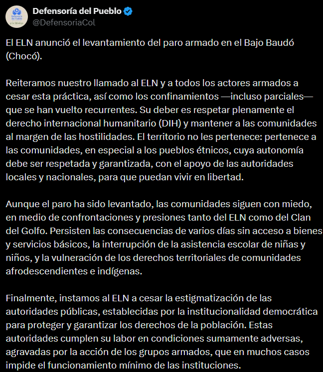 La Defensoría del Pueblo confirmó que más de 6.000 habitantes quedaron confinados durante el paro armado y reiteró que este tipo de acciones vulnera el Derecho Internacional Humanitario al afectar a la población civil y restringir bienes indispensables para su supervivencia. La entidad pidió al ELN y a los demás grupos armados cesar estas prácticas y respetar los derechos de las comunidades. En uno de sus pronunciamientos señaló que “el territorio no les pertenece, pertenece a las comunidades”.