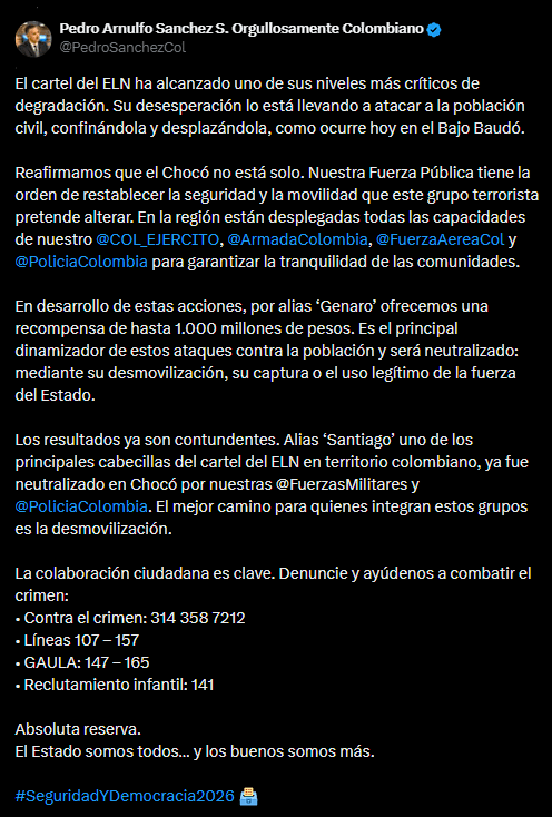 Sánchez calificó el accionar del ELN como un crimen de guerra y afirmó que atacar y confinar a la población civil, cuando se hace de manera sistemática, constituye también un crimen de lesa humanidad. Añadió que la recompensa hace parte de la estrategia para capturar a los responsables del paro armado.