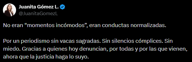 Las reacciones crecieron porque varias periodistas plantearon que el caso no es un episodio aislado, sino parte de un problema más amplio dentro de las redacciones y otros espacios laborales de los medios. Juanita Gómez sostuvo que estos hechos no deben reducirse a “momentos incómodos”, sino entenderse como conductas de acoso normalizadas.