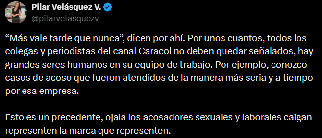 A esos pronunciamientos se sumó Pilar Velásquez, periodista de Win Sports, quien afirmó que conoce casos de acoso que sí fueron atendidos con seriedad y pidió que este escándalo siente un precedente para sancionar a los responsables, sin importar la empresa a la que pertenezcan. Su intervención reforzó la idea de que el debate ya no se limita a un solo canal, sino que toca prácticas extendidas en la industria.