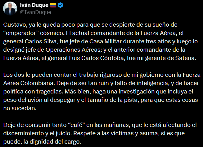 La controversia comenzó cuando Petro calificó la aeronave accidentada como una “chatarra” y señaló que debía investigarse quién fue el contratista y por qué se tomó esa decisión en la administración de Duque. En respuesta, el exmandatario rechazó esos señalamientos, defendió su gestión en defensa y le pidió al presidente dejar de “hacer política con tragedias” y concentrarse en establecer causas técnicas como el peso del avión al despegar y la longitud de la pista.