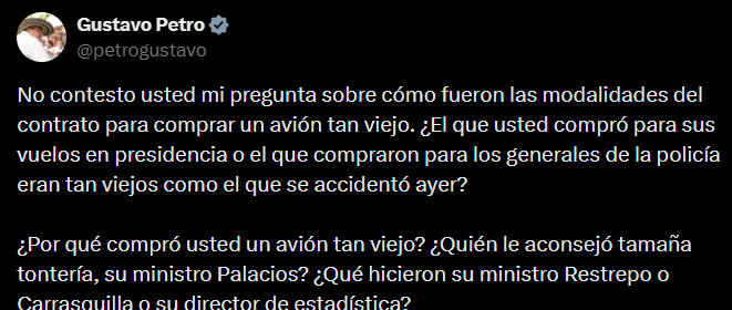 Petro volvió a pronunciarse después de ese mensaje y elevó el tono del enfrentamiento. El presidente preguntó públicamente por las modalidades del contrato con el que se compró el avión accidentado y comparó esa adquisición con otras aeronaves usadas para vuelos presidenciales y para altos mandos de la Policía. También mencionó a exfuncionarios del gobierno Duque, entre ellos Daniel Palacios, Juan Carlos Restrepo, Alberto Carrasquilla y el entonces director de estadística, al insistir en que se aclare quién recomendó la compra y qué papel tuvieron en esa decisión.