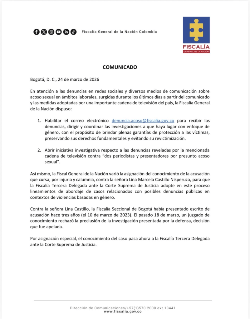 Bogotá, 24 de marzo de 2026 – Caracol Televisión anunció la salida de los periodistas Jorge Alfredo Vargas y Ricardo Orrego en medio de denuncias internas por acoso sexual que ya están bajo investigación de la Fiscalía. La empresa informó que el contrato de Vargas terminó por mutuo acuerdo, mientras que Orrego fue desvinculado de forma unilateral, y aclaró que estas decisiones no implican una conclusión sobre responsabilidades.