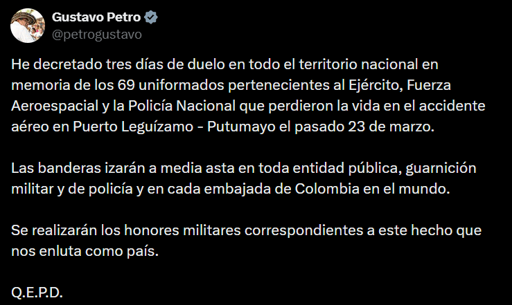 En un mensaje publicado en X, el presidente Petro anunció la decisión y señaló que el duelo busca honrar a los uniformados fallecidos en cumplimiento de su deber. “He decretado tres días de duelo en todo el territorio nacional en memoria de los 69 uniformados”, escribió. El decreto también establece la realización de ceremonias militares en distintas regiones del país.