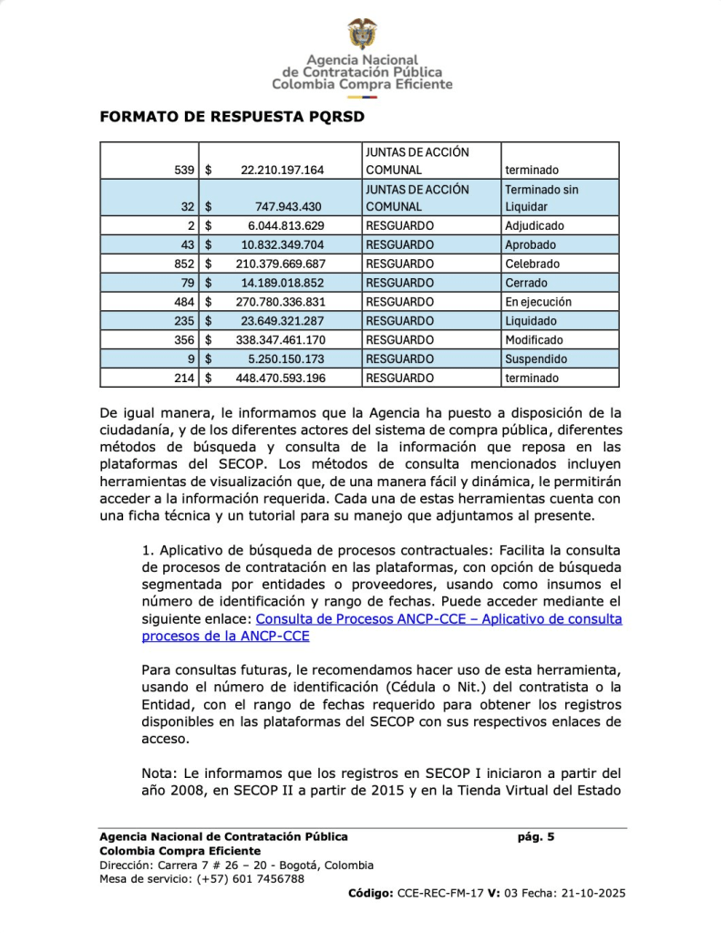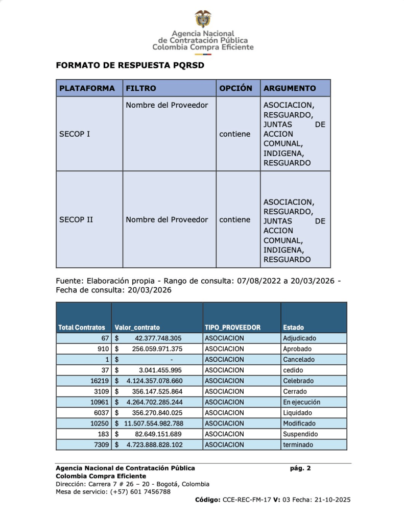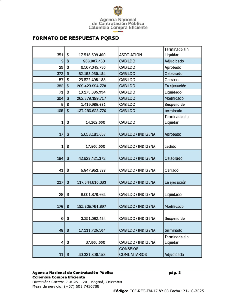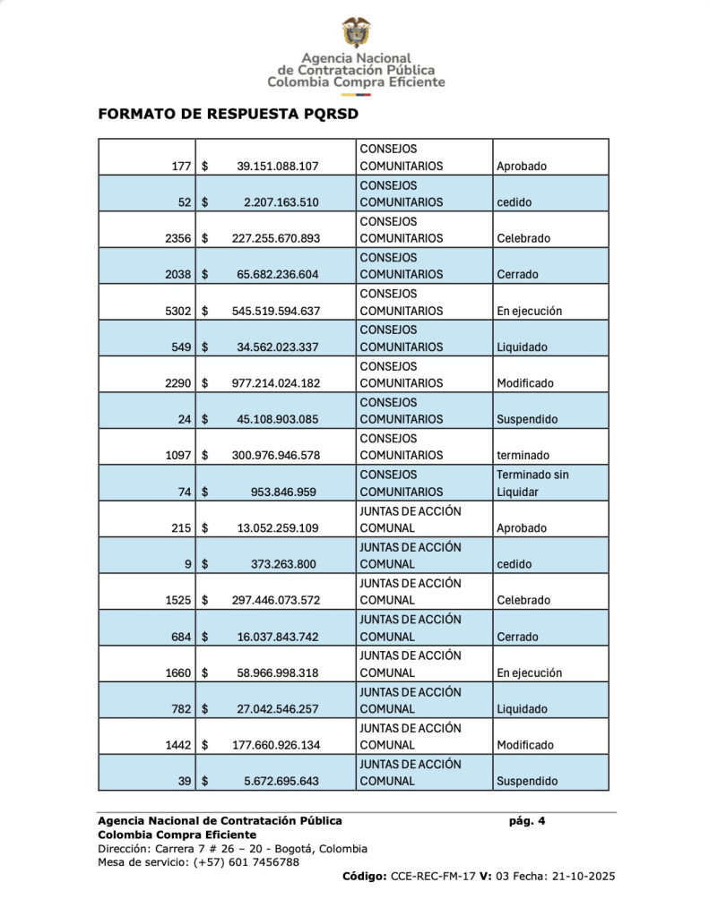 Los datos, obtenidos a partir de un reporte de Colombia Compra Eficiente, dan cuenta de 80.734 contratos celebrados con juntas de acción comunal, asociaciones comunales, consejos comunitarios, resguardos y cabildos. La mayor parte de los recursos se concentró en asociaciones comunales, que acumulan más de 25 billones de pesos en 55.434 contratos, seguidas por consejos comunitarios con más de 2 billones y resguardos con más de 1 billón.