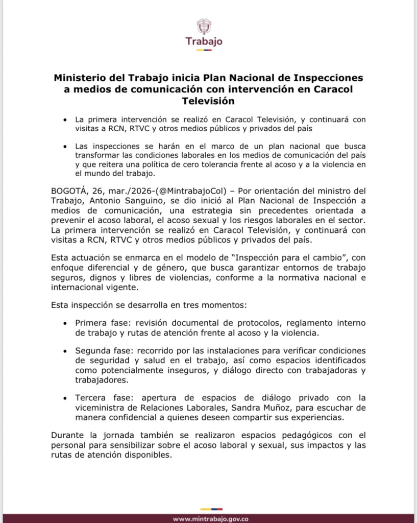 Bogotá, 26 de marzo de 2026 – El Ministerio de Trabajo puso en marcha un plan nacional de inspección a medios de comunicación y comenzó con una visita formal a Caracol Televisión en Bogotá, tras las denuncias de presunto acoso sexual que derivaron en la salida de los presentadores Ricardo Orrego y Jorge Alfredo Vargas. La medida busca revisar protocolos laborales y condiciones frente a violencias basadas en género en el sector.