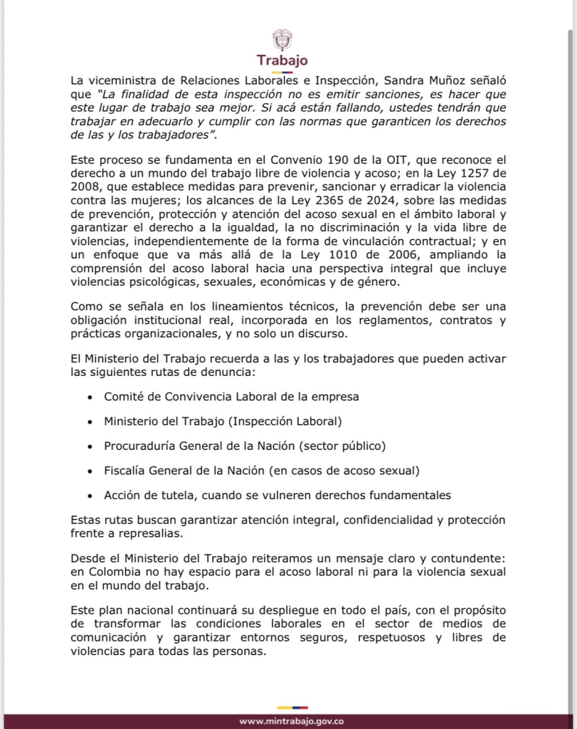 El Ministerio explicó que el plan se fundamenta en el Convenio 190 de la OIT y en la legislación colombiana vigente sobre violencia de género en el trabajo. Según la entidad, el objetivo es garantizar entornos laborales seguros y verificar el cumplimiento de obligaciones por parte de los empleadores. La intervención no se limitará a Caracol, también se extenderá a RCN, RTVC y otros medios públicos y privados donde existan denuncias o riesgos identificados.