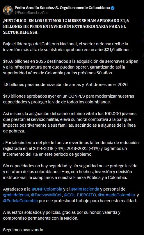 El componente aéreo está ligado a la compra de 17 aviones de combate Gripen a la empresa sueca Saab, contrato firmado en noviembre de 2025 por 16,5 billones de pesos y financiado hasta 2032. El presidente Petro ha defendido que el esquema de pagos escalonados busca mitigar el impacto fiscal y aseguró que la operación fue revisada por la Contraloría sin hallazgos.