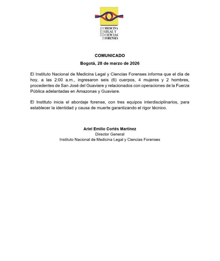 Bogotá, 28 de marzo de 2026 – Los seis cuerpos de integrantes de las disidencias del Estado Mayor Central abatidos en una operación militar en Pacoa, Vaupés, fueron trasladados al Instituto Nacional de Medicina Legal, donde serán sometidos a pruebas forenses para confirmar su identidad y establecer si entre ellos está alias “Iván Mordisco”.