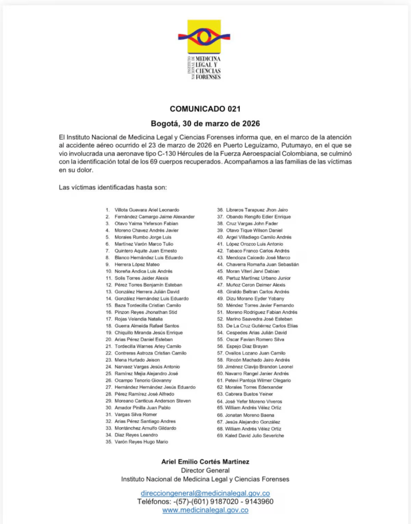 Bogotá, 30 de marzo de 2026 – El Instituto Nacional de Medicina Legal confirmó hoy la identificación de las 69 personas fallecidas en el accidente de un avión C-130 Hércules de la Fuerza Aeroespacial Colombiana ocurrido el pasado 23 de marzo en Puerto Leguízamo, Putumayo. Con este anuncio se cerró la fase técnico-forense de identificación de las víctimas, que incluyó abordaje de cuerpos, necropsias y cotejo genético con muestras de familiares.