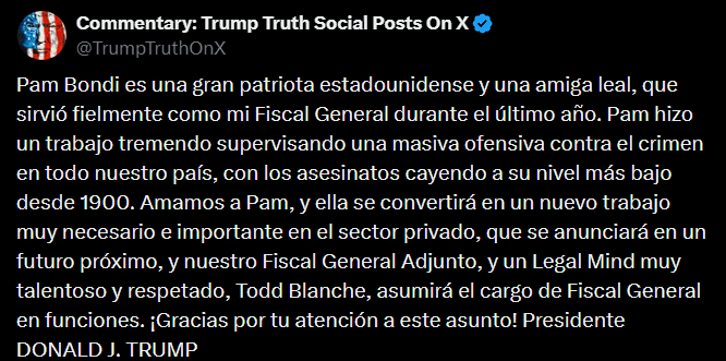 La decisión fue comunicada el jueves 2 de abril de 2026 a través de Truth Social, la red del mandatario, donde destacó la gestión de Bondi y aseguró que deja el cargo en buenos términos. “Hizo un trabajo tremendo supervisando una ofensiva masiva contra el crimen en todo nuestro país”, escribió. También afirmó que los homicidios alcanzaron su nivel más bajo desde 1900, una cifra que no ha sido confirmada por estadísticas oficiales.