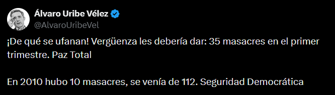 A partir de estos datos, Álvaro Uribe publicó un mensaje en X en el que cuestionó la política de “paz total” del gobierno Petro. “¡De qué se ufanan! Vergüenza les debería dar 35 masacres en el primer trimestre. Paz Total. En 2010 hubo 10 masacres, se venía de 112. Seguridad Democrática”, escribió el exmandatario.