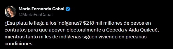 En una publicación en X, Cabal afirmó “¿Esa plata le llega a los indígenas? 218 mil millones de pesos en contratos para que apoyen electoralmente a Cepeda y Aida Quilcué, mientras tanto, miles de indígenas siguen viviendo en precarias condiciones”. Su crítica apunta tanto al impacto real de los recursos como a un posible uso político de la contratación.