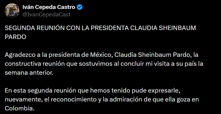 Cepeda publicó en su cuenta de X que se trató de una “segunda reunión” con Sheinbaum y agradeció la “constructiva reunión” sostenida, destacando que pudo reiterarle a la presidenta el reconocimiento y la admiración que ella despierta en Colombia. La comunicación del candidato dejó claro que la cita no fue casual ni protocolaria, sino parte de una relación política que viene cultivando con referentes del progresismo latinoamericano.