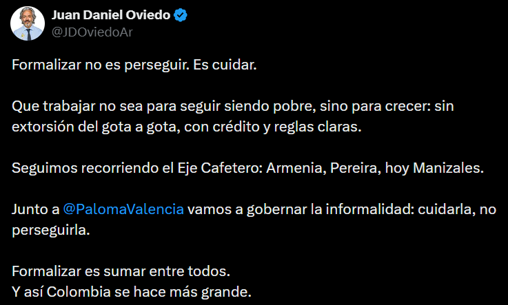 Además de pronunciarse sobre la polémica, Oviedo presentó propuestas para fortalecer la economía del Eje Cafetero, destacando el empleo formal, el apoyo al turismo, la agroindustria, la tecnología y la infraestructura vial y aeroportuaria, incluido el Aeropuerto del Café. La fórmula vicepresidencial buscó así combinar la defensa del orden electoral con la exposición de un plan productivo regional.